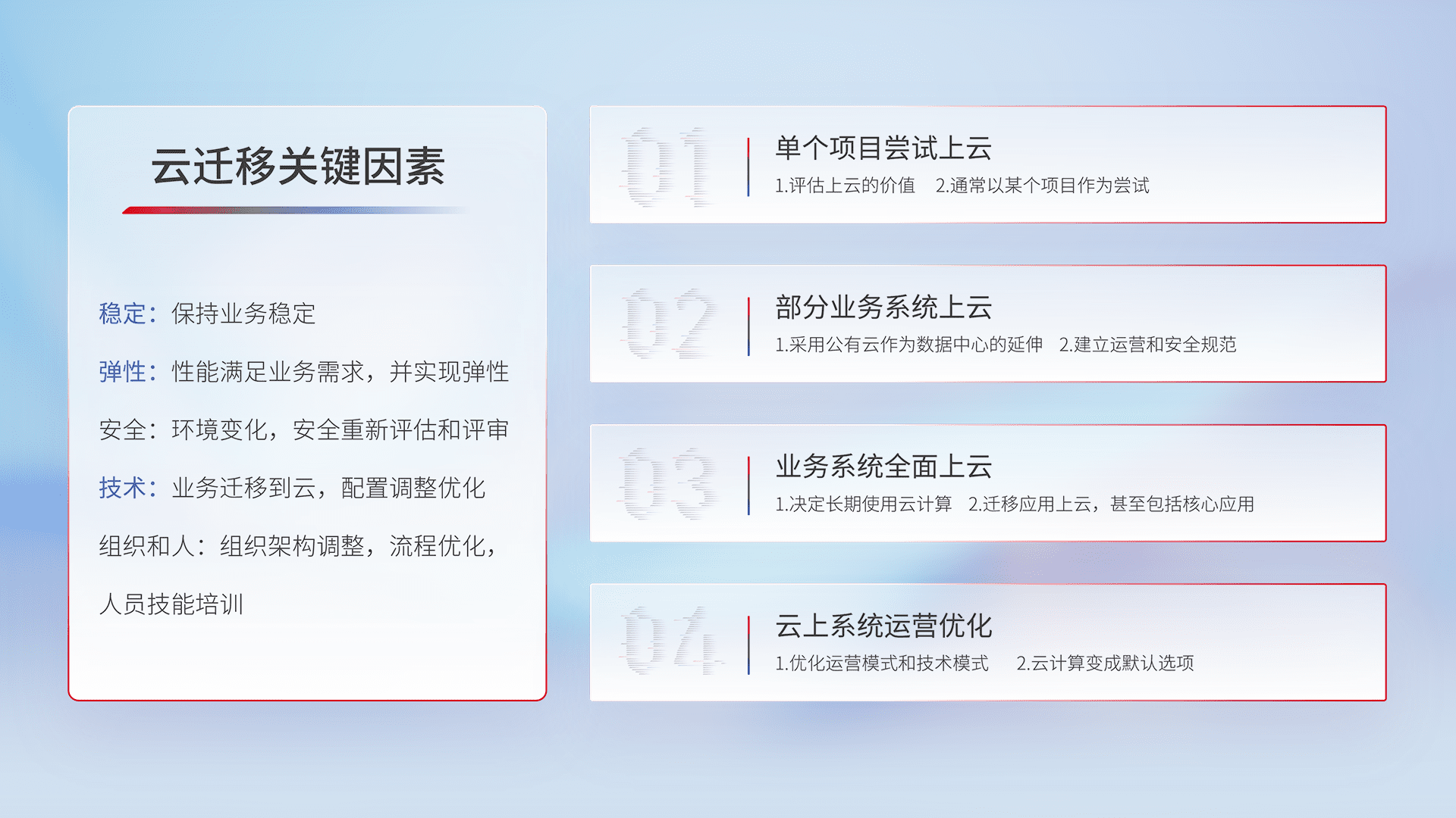 结合实际业务,,,从规划设计、、、云平台选型、、、云原生改造、、、数据迁移、、、、集成交付,,迁移全过程为客户识别最佳上云路径,,,做好风险识别管理,,,设计网络架构、、身份权限、、、安全审计合规、、操作审计、、、、日志审计、、、监控告警策略、、、多站点容灾设计等,,,,对云上基础设施进行整体规划,,提升IT治理水平,,,以满足弹性、、、高可用、、、高性能的需求。。。。