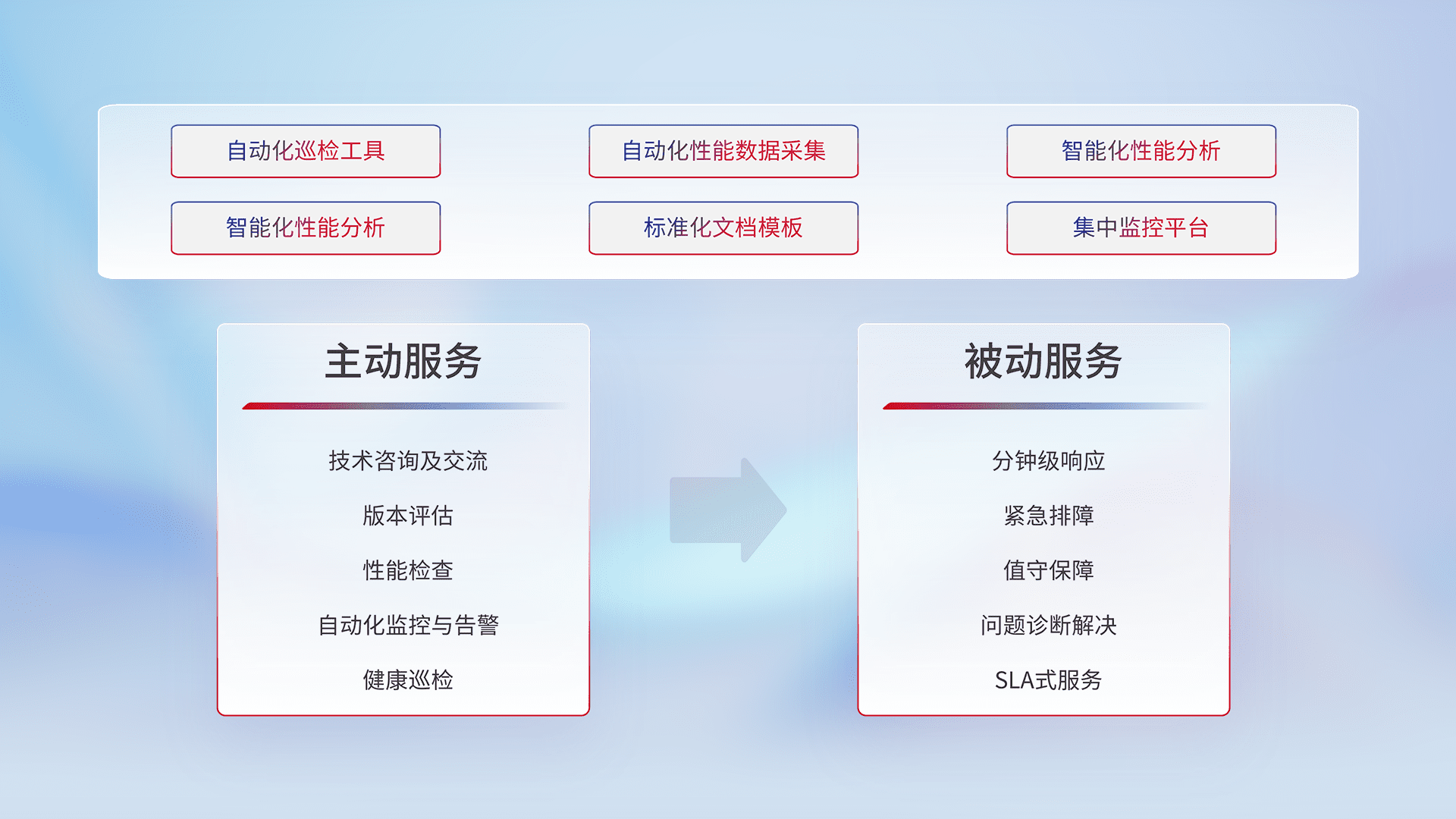 智能化工具和标准化文档,,保障服务质量,,,提供主动服务(包含技术咨询、、版本评估、、、、性能检查、、、自动化监控与告警、、、、健康巡检)和被动服务包含(分钟级响应、、紧急排障、、值守保障、、问题诊断解决、、、、SLA服务)。。
